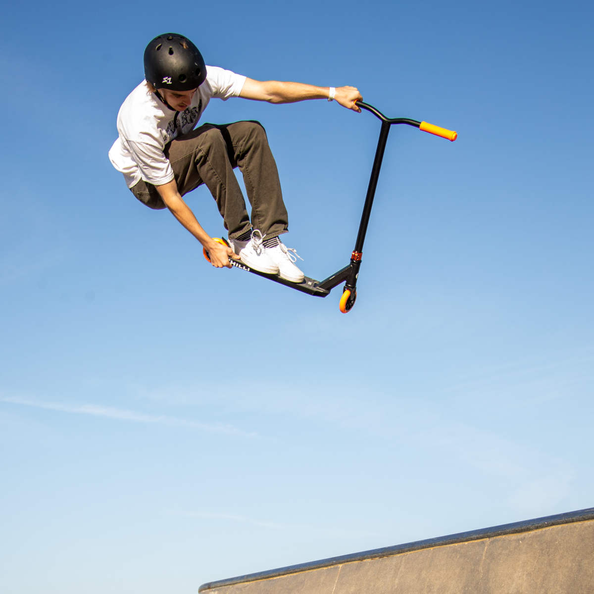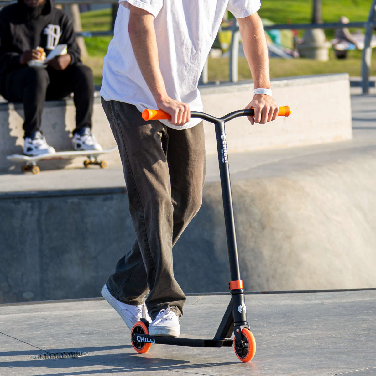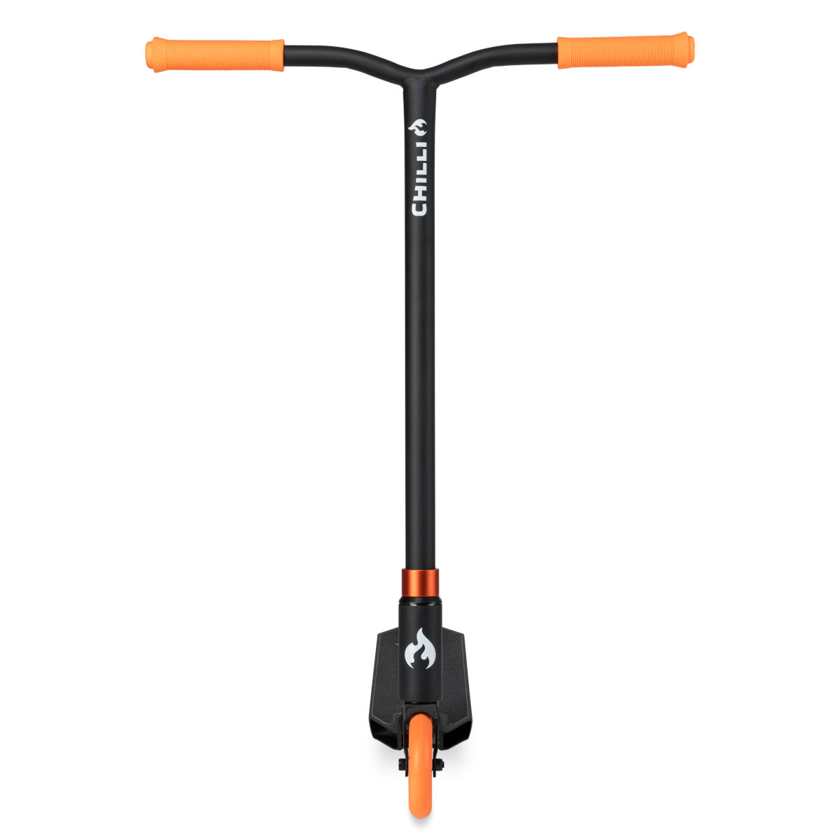 Chilli Base oranžová je kvalitní freestyle koloběžka pro začínající jezdce, kteří chtějí zvládnout základy freestylové jízdy ve skateparku nebo na rampě a nechtějí dělat kompromisy v kvalitě koloběžky.